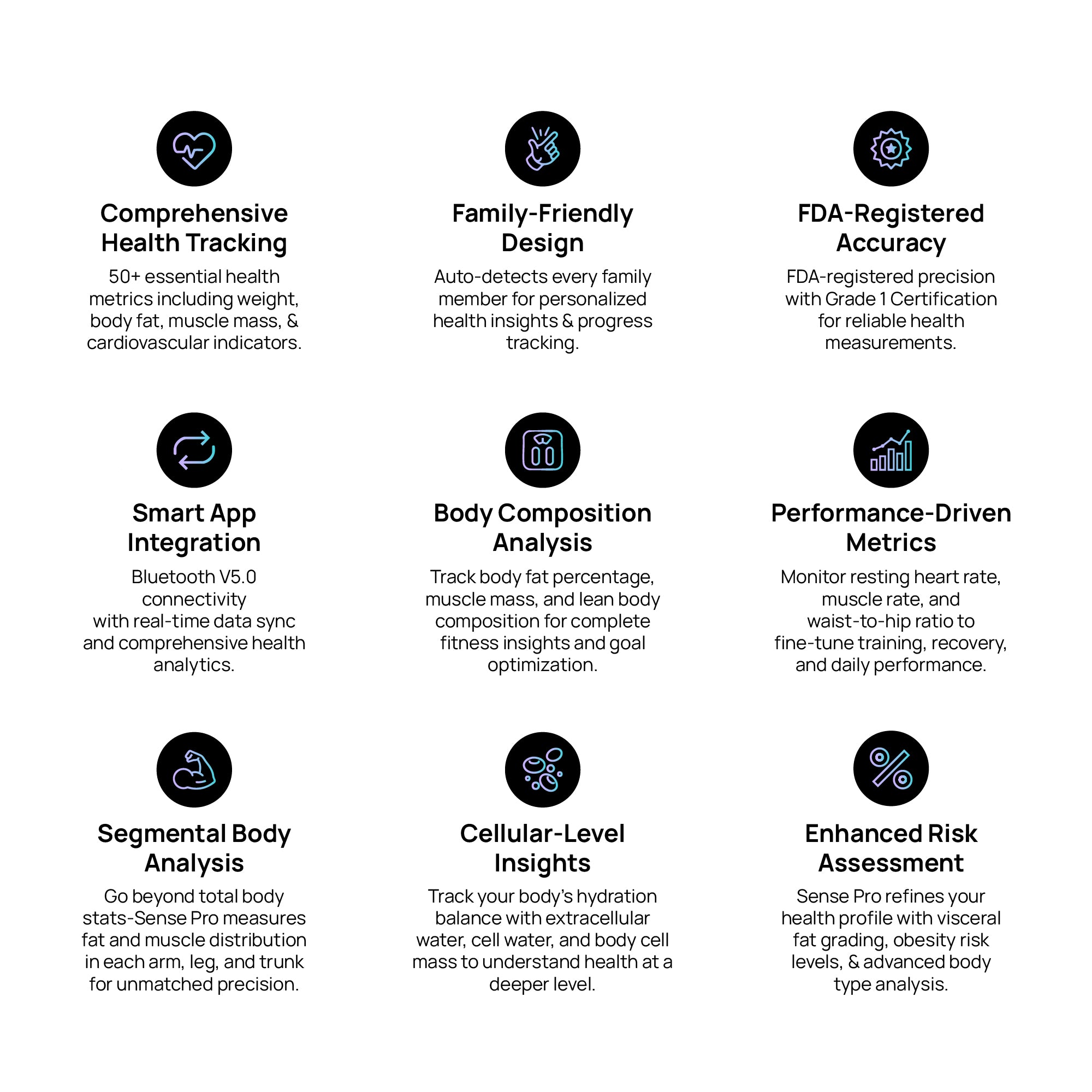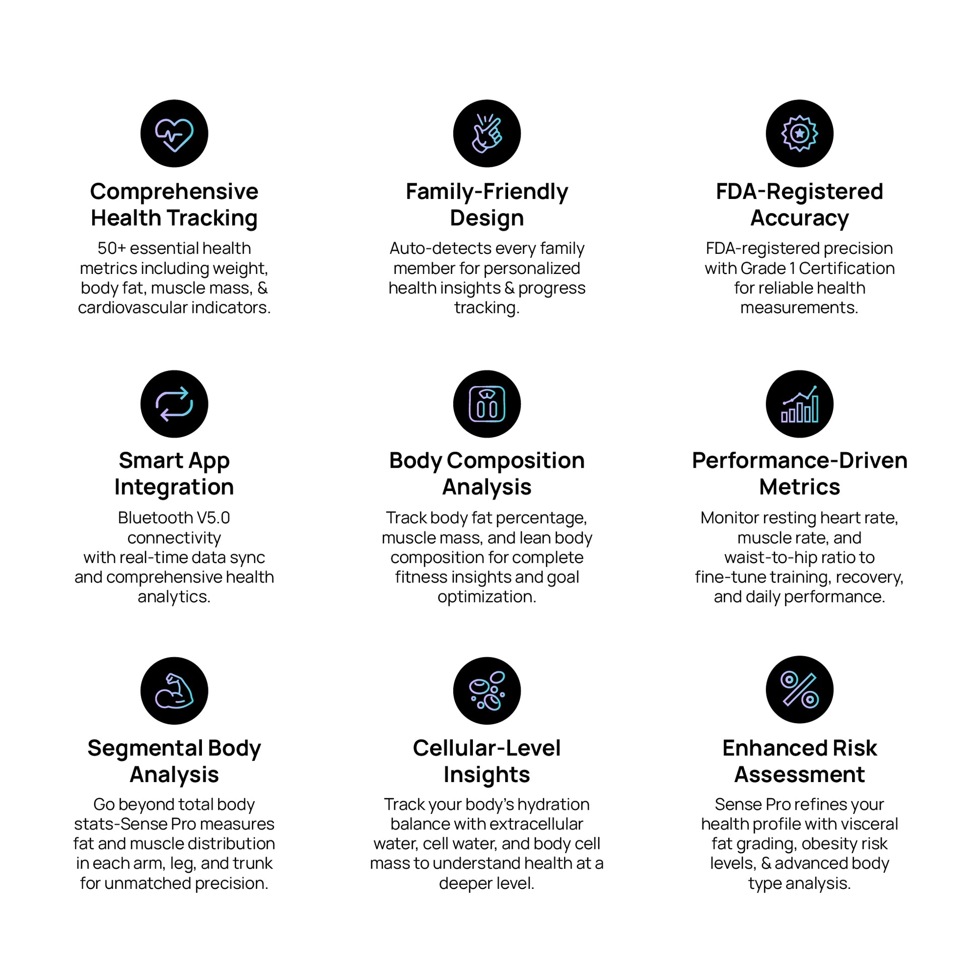 Sense Pro refines your health profile with visceral fat grading, obesity risk levels, & advanced body type analysis.