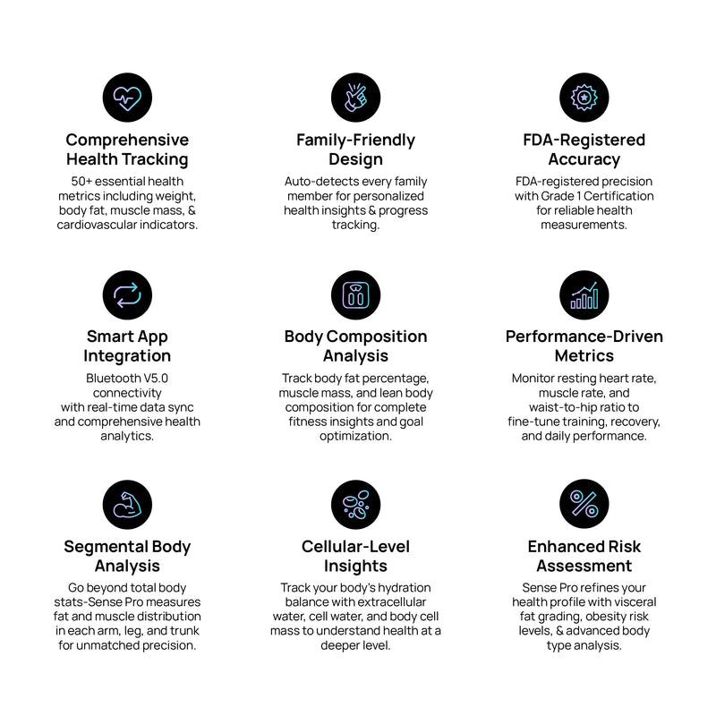Built for high-performers, the SENSE Pro Smart Scale isn’t just an upgrade, it’s a whole new league. With 8 high-precision electrodes and dual-frequency BIA technology, it offers 50+ body metrics that go beyond weight. From visceral fat to metabolic age, hydration to limb-level muscle mass, this is data designed to drive real transformation. If you train like a pro, track like one.